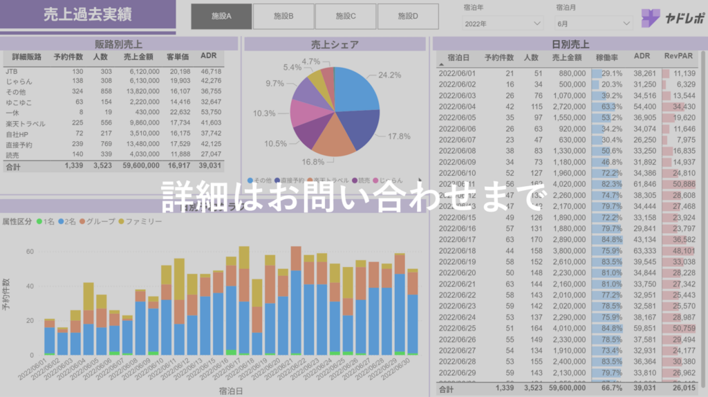 ホテル・旅館の予約や会計データ、アンケート、マーケティング施策の成果など、